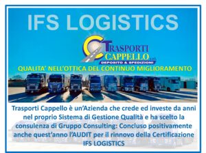 Credere nella certificazione di qualità significa investire in qualcosa che d prestigio alla propria Azienda e contemporaneamente garantisce ai propri Clienti una vera e grande Qualità dei servizi offerti. E’ quello che fa da anni Trasporti Cappello srl che si è rivolta ai Consulenti di Gruppo Consulting per essere seguiti in tale percorso. Complimenti per il superamento positivo dell’audit periodico di rinnovo della certificazione secondo lo standard internazionale IFS Logistics.